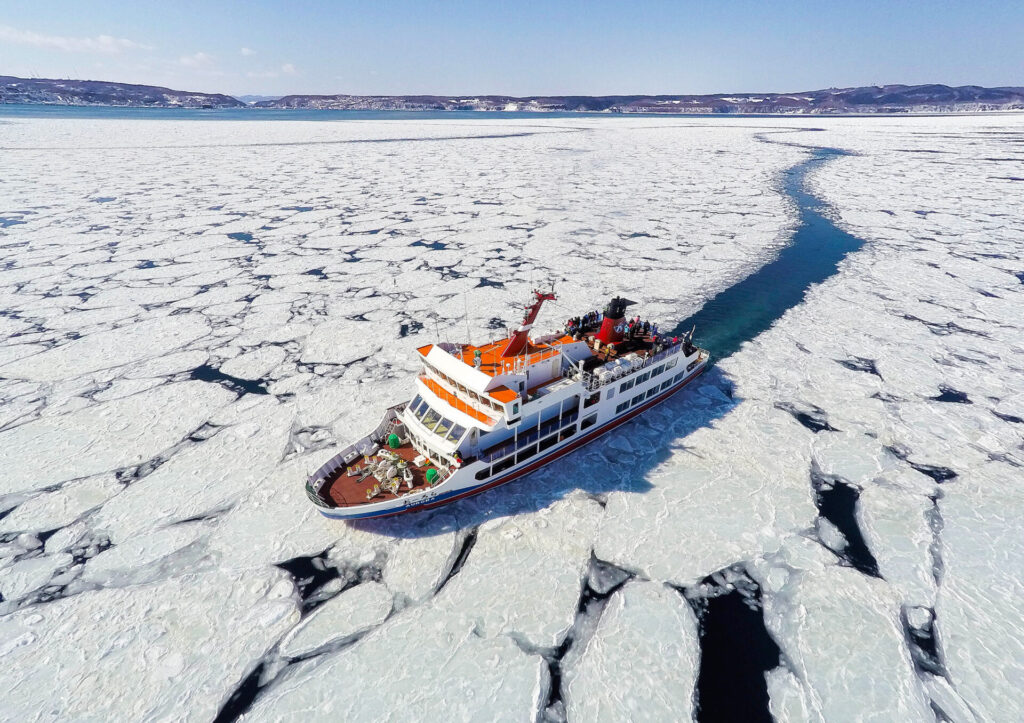南極観測船と同様、氷の上に船首を乗り上げ、船の重みで氷を割って進む「流氷観光砕氷船おーろら」。定員は各400人で、キャビンは3層。高い位置からは流氷原を見渡すことができ、低い甲板からはダイナミックな流氷を間近に見られる。時には海鳥が近づいてきてくれたり、流氷の上にたたずむアザラシが見えることもあるそう。揺れも少ない大型船だから、安心して流氷を眺められる。おーろらに乗って流氷を間近に感じてみよう。