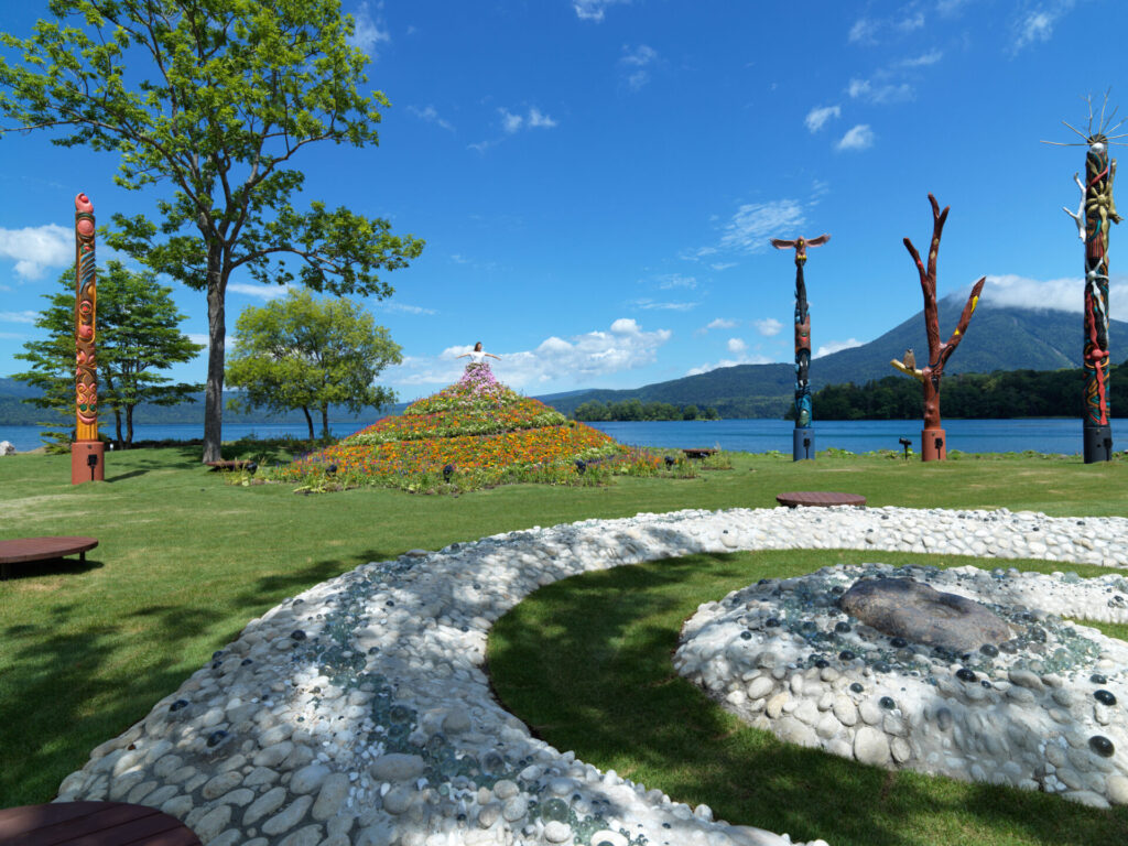 阿寒湖畔にあるホテル「あかん遊久の里鶴雅」の中にある、縄文文化やアイヌ文化、自然が融合した新しい形のガーデン「阿寒イオマプの庭」。中央のドレスガーデンに上がると、美しいお花のドレスをまとっているかのような写真を撮影できる。夜は、「プロジェクションマッピング」が行われ、昼間とは違った雰囲気が感じられる。