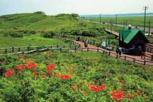 オホーツク海と濤沸(とうふつ)湖に挟まれた約8km(275ha)の細長い丘陵地帯。クロユリの花がオホーツクの短い夏の到来を告げると、濤沸湖の湖畔にセンダイハギや
